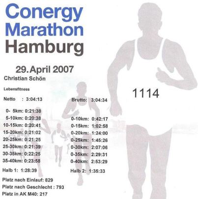 Man sagt die Regeneration danach stört den Trainingsaufbau für das große Ironmanereignis, zudem läuft man Gefahr, dass Muskelzellen so zerstört werden, dass sie bis dahin nicht regenerieren. Der Ironman ist schwer zu kalkulieren, da nach 3,8 KM schwimmen und 180 KM Radfahren das Laufen schwer zu planen ist. Merkt man da evtl. noch den Marathon, den man im Frühjahr gelaufen ist? Oder merkt man, dass man keinen gelaufen ist? Ich denke, dass muß jeder für sich herausfinden. Dieses Jahr war ich zwar wieder angemeldet, aber eigentlich wollte ich nicht starten. Ganz schön blöde, in meiner Heimatstadt, 20.000 Starter, tolles Wetter und dazu noch unglaubliche Fitness. Ich entschied den Lauf ruhig durchzuziehen. Meine letzte Laufeinheit im Alstertal war immerhin schon 3 Stunden 20 Minuten, so dass ruhige 4 Stunden doch machbar sein müssten!? Ich entschied doch zu starten und startete mit einem Puls von 125 und ließ diesen fast 4 Stunden dort. Es war ein ungewöhnliches Gefühl, denn um mich herum sehr angestrengte Läufer, die am Limit den Lauf absolvierten. Fast Jeder hat das Ziel einer neuen persönlichen Bestzeit. Ich lief über 10 KM/H sehr locker mit diesem niedrigen Puls und finishte in 3 Stunden 56 Minuten. Noch vor 4 Jahren lief ich 3 Stunden 45 mit einem Puls bei 160. Was ist da passiert? Der Herzmuskel muß einen riesen Schub gemacht haben, er bekommt mit einem Schlag viel mehr Effizienz hin als noch vor 4 Jahren! Im Ziel angekommen ging ich kurz nach Haus, etwas essen, dann gab ich eine heftige Spinningstunde und trainierte im Anschluß noch eine kürzere Schwimmtrainingseinheit von 1 KM. Der völlig fehlende Muskelkater bestätigt die für mich richtige Entscheidung den Marathon zu laufen. Es war ein super motivierender langer Trainingslauf! |
